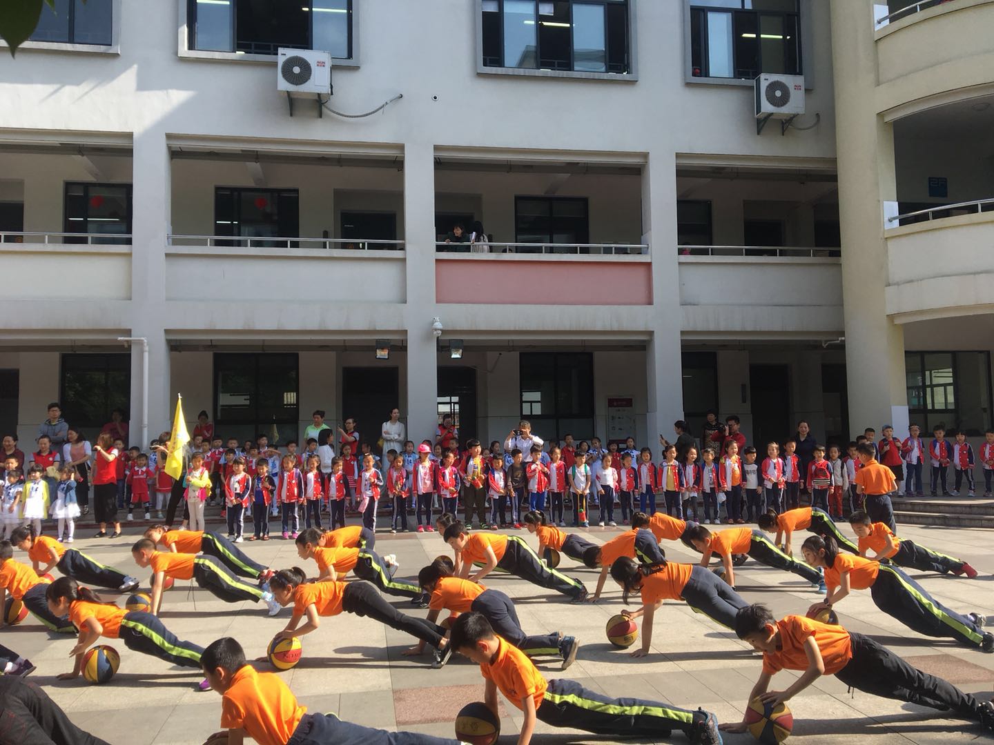 踏入賓虹小學,小朋友們被一個個跳動的七彩精靈所吸引。操場上,不同年齡段的學生在跳著富有特色的素質操,另小朋友們一邊參觀,一邊不停地贊嘆。