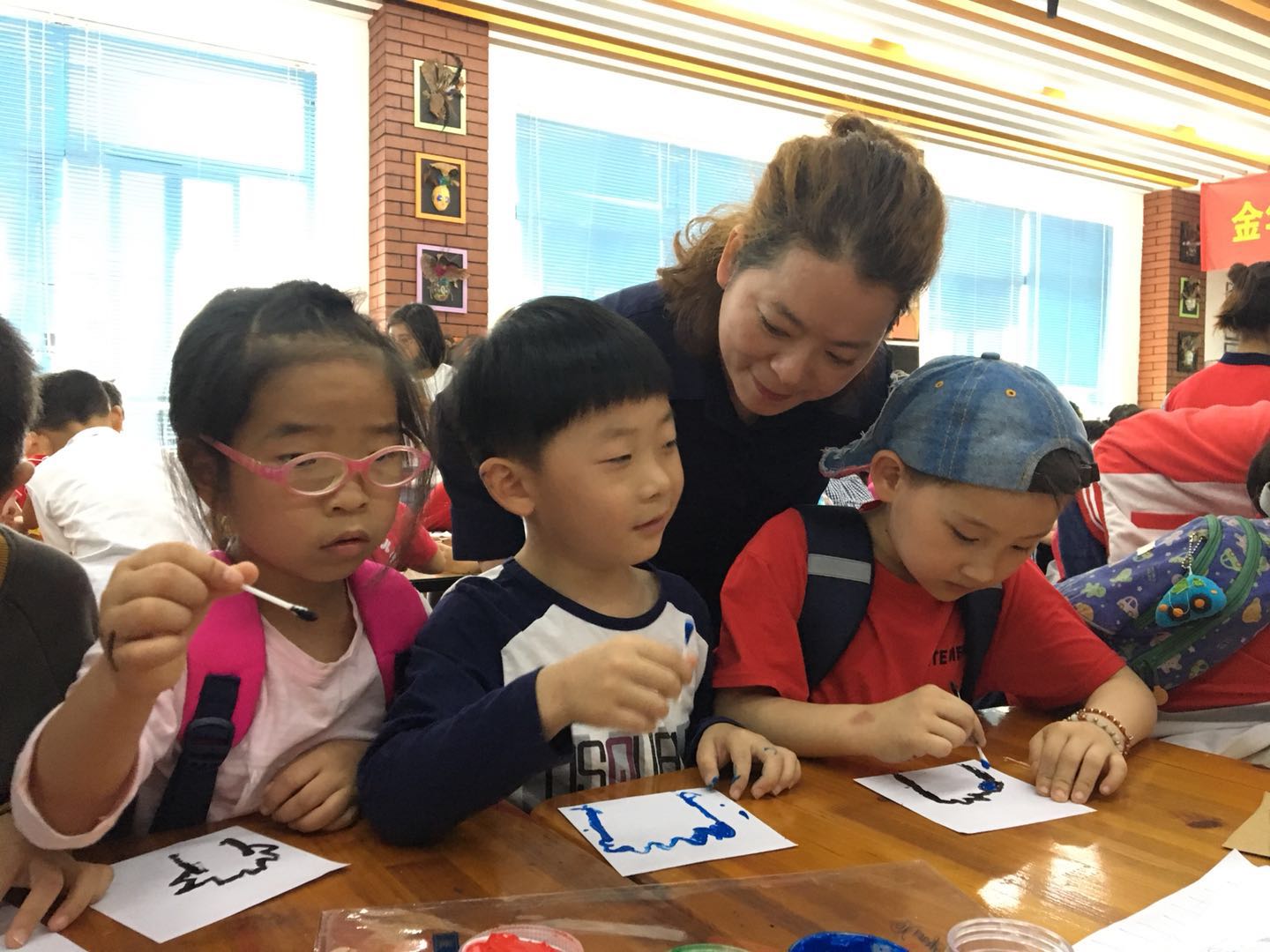 跟著老師的步伐,小朋友們走到了賓虹小學的美術標點工作室,聆聽著賓虹小學黃老師的美術課,和哥哥姐姐一起繪制校徽,一起參與涂色,共同描繪七彩智慧樹。