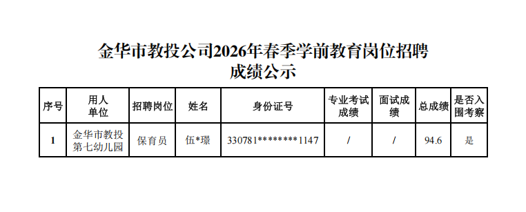 金華市教投公司2026年春季學前教育崗位招聘成績公示